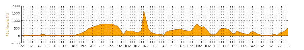 Here we can see a similar scenario, with widespread southwest winds spreading over the valley...but not quite in the valley yet. In central parts of the valley, more typical lighter easterly winds are found. A quick glance at a sounding and forecast PBL height time series show that mixing is indeed the issue here. Unidirectional westerly flow aloft would certainly support southwest winds, but a stout inversion and clouds are creating conditions where the PBL is struggling to mix up to even 1kft AGL in the valley. This is often a forecast challenge to determine how far across the valley these southwest winds will push.
